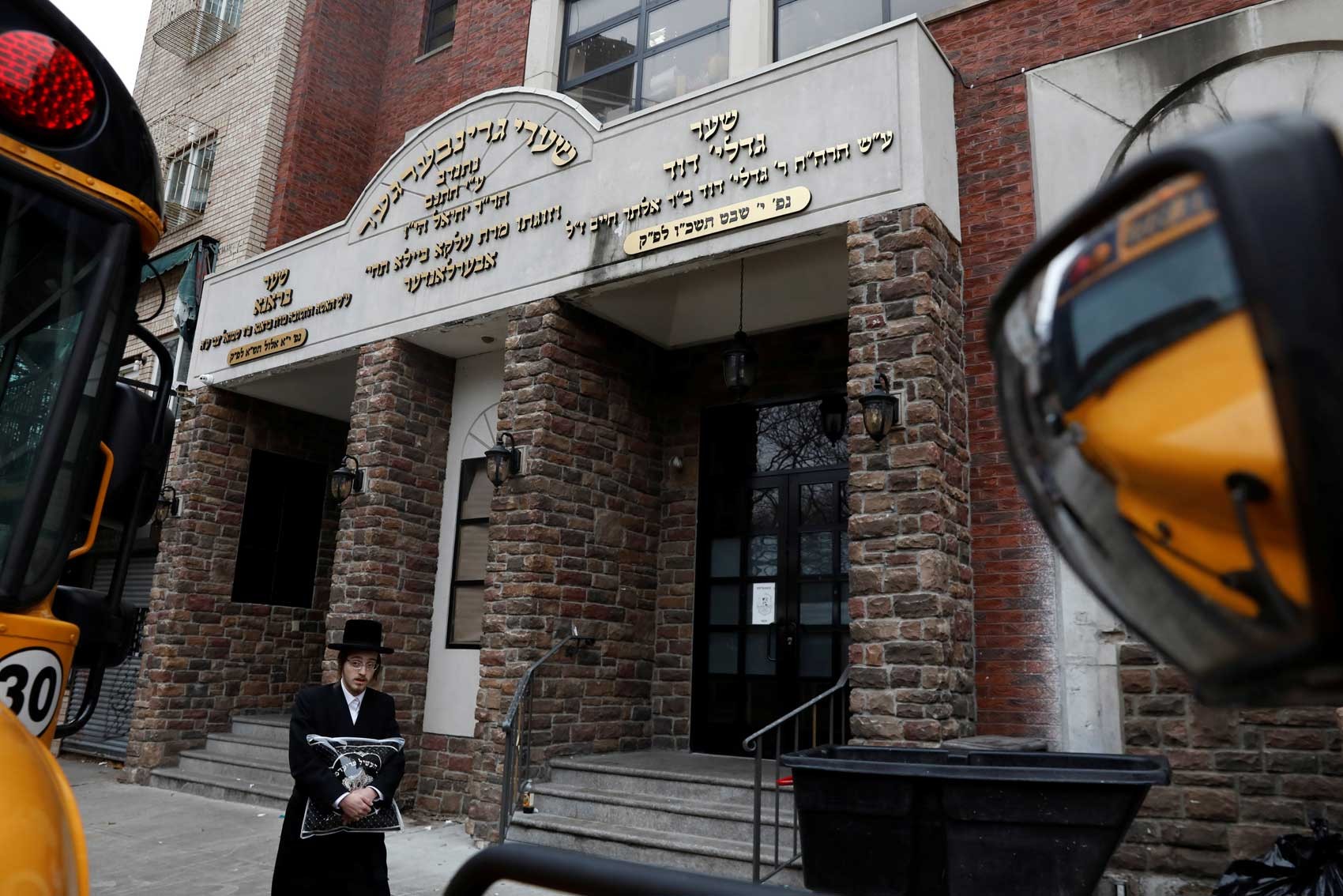 Homem passa perto de escola judaica no Brooklyn, em Nova York.