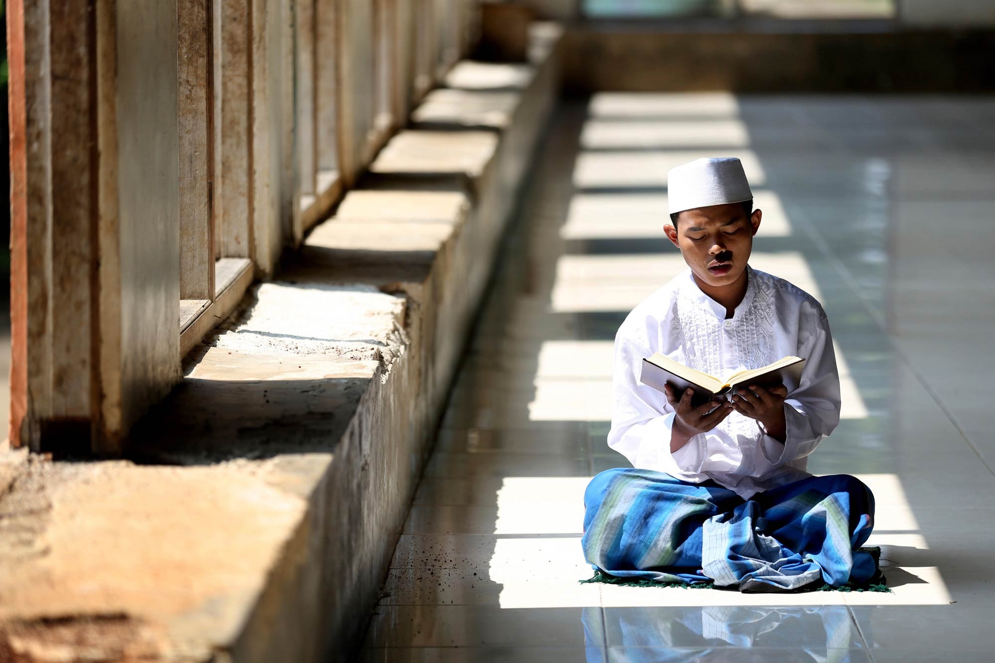 Estudante lê o Alcorão enquanto jejua como parte do mês islâmico de jejuns do Ramadã no internato Al-Ashriyyah Nurul Imã em Parung, na Indonésia